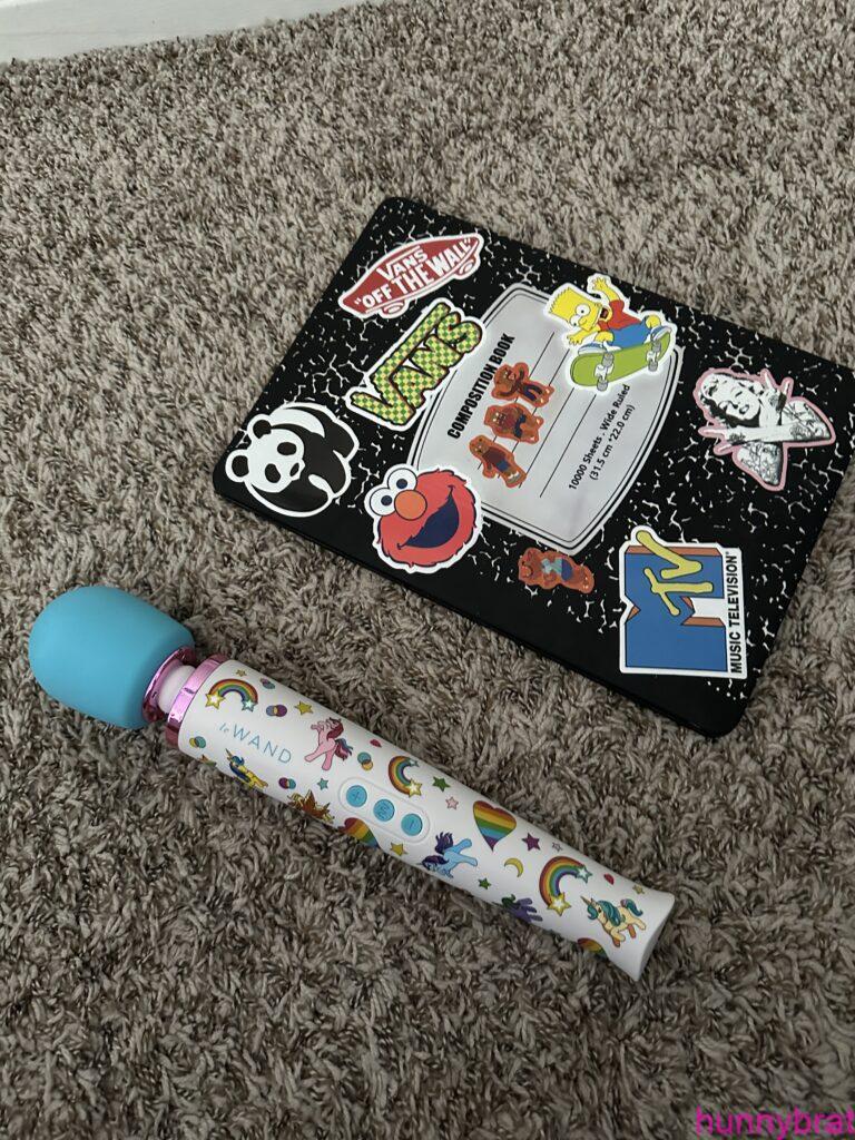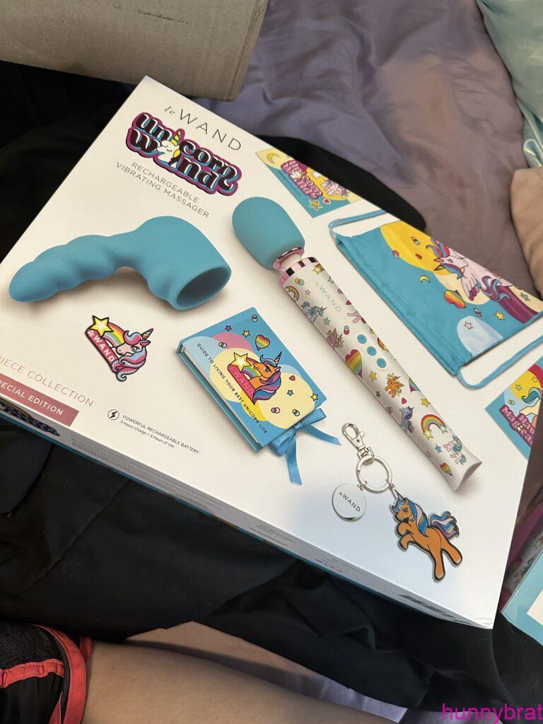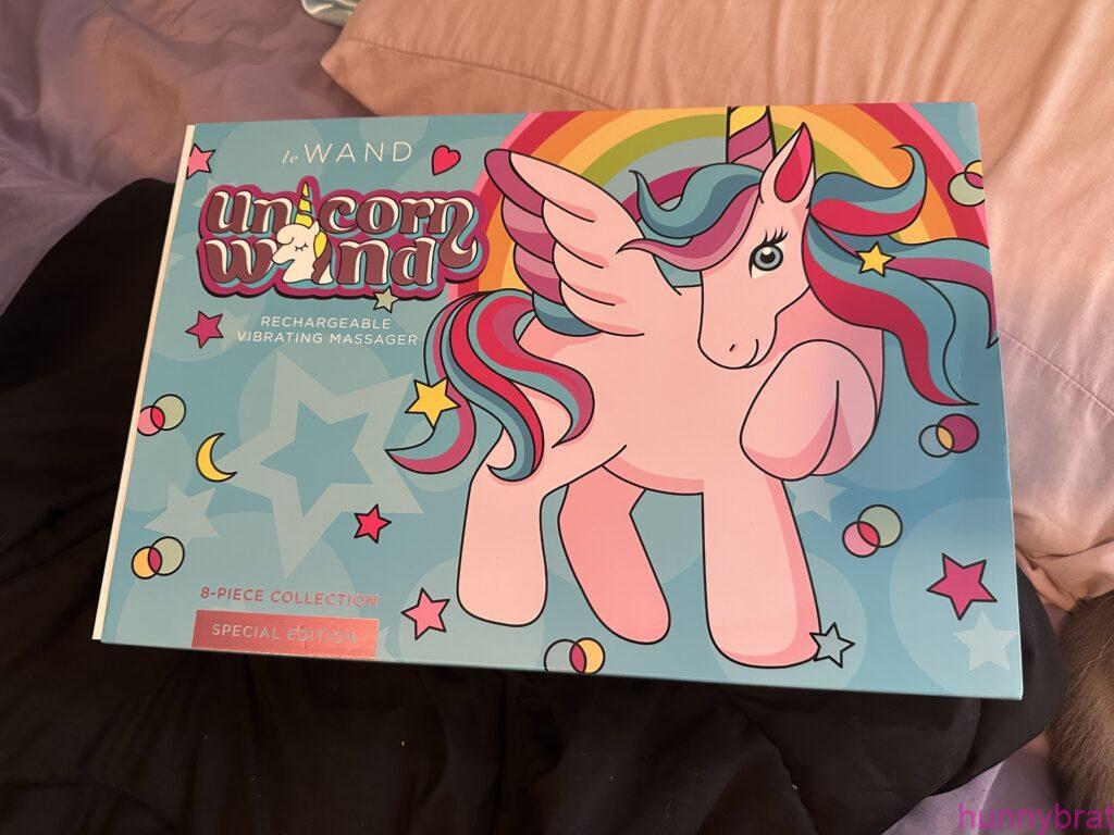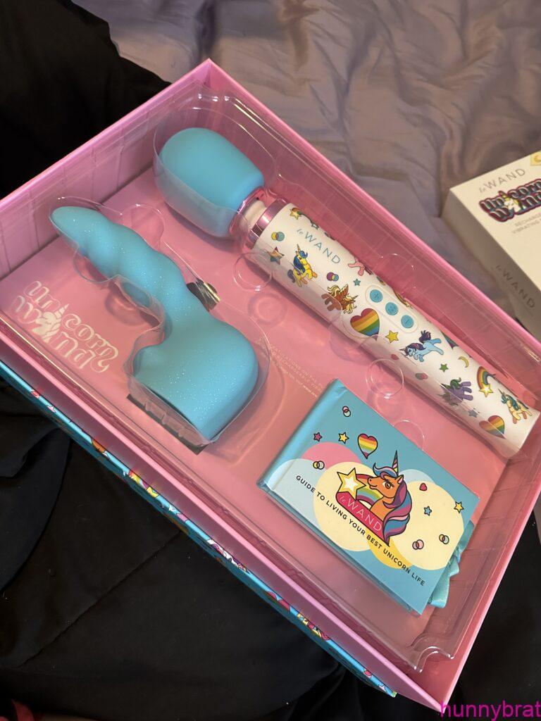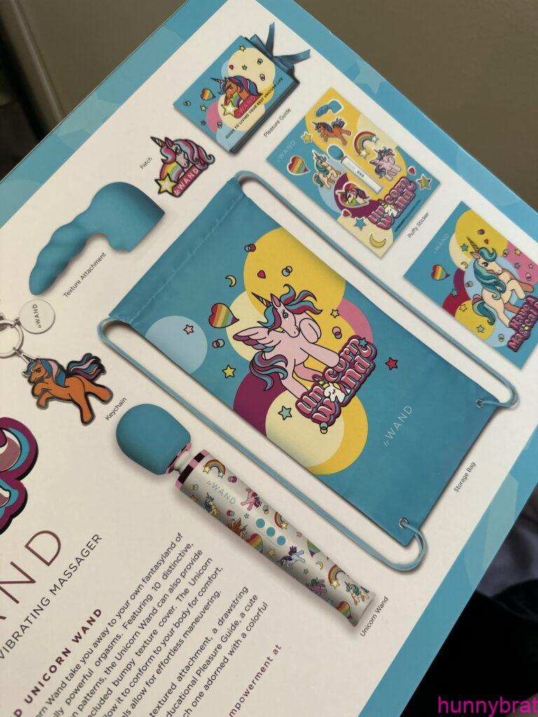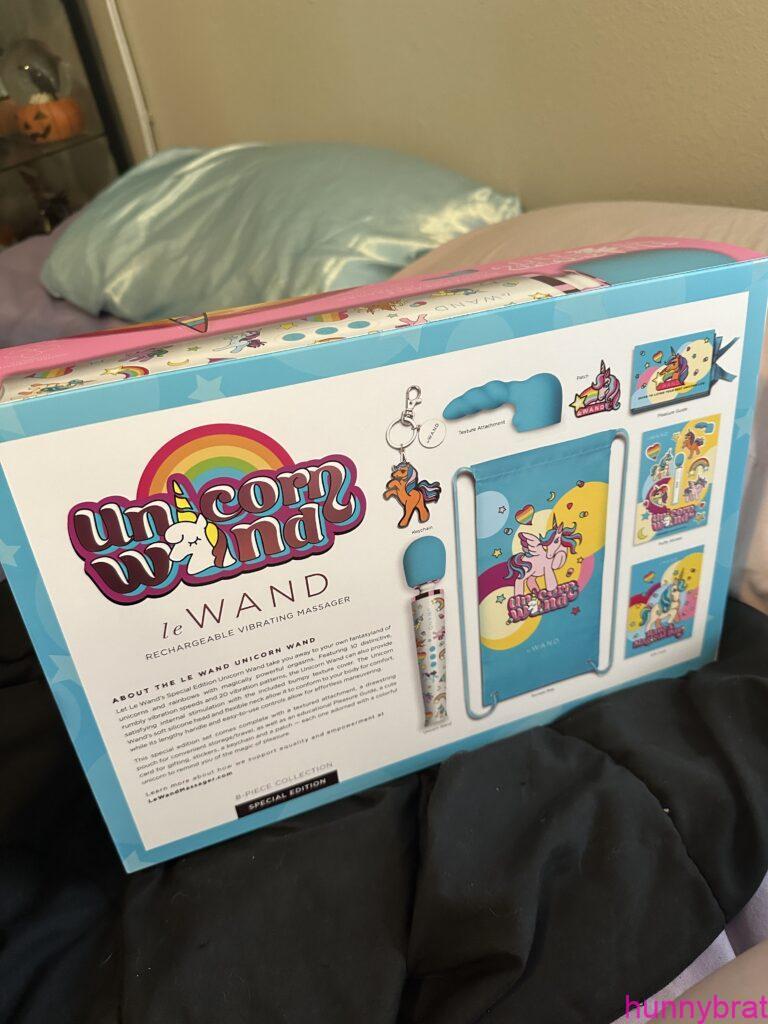 I had to make a post about this because it’s so freakin’ cute. I retired my Hitatchi Magic Wand a while ago, and decided I needed a new wand vibe and went with this one. In true Sam fashion (that’s my real name, by the way) I went with something bright and extravagant: Le Wand Unicorn Wand. The packaging is adorable, of course: