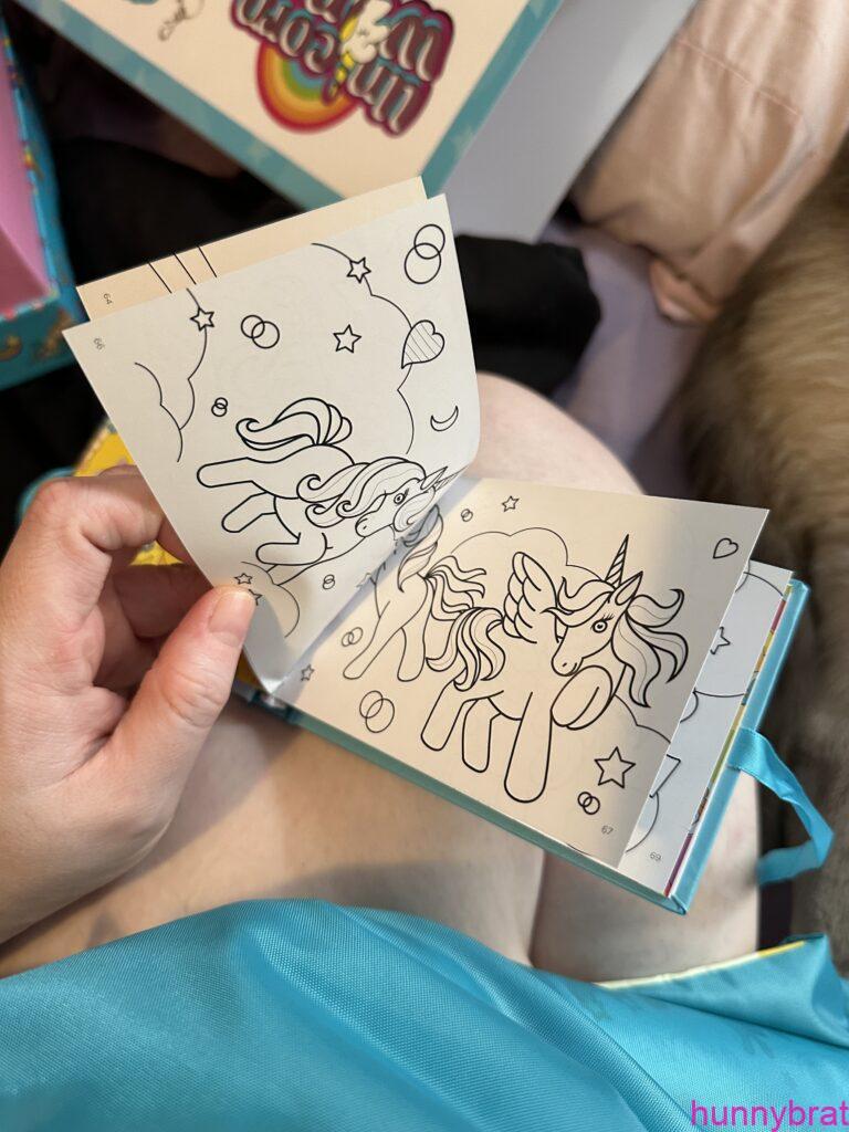 It came with a patch, stickers, a keychain, the uniorn horn attachment and a guide turned coloring book LOL.