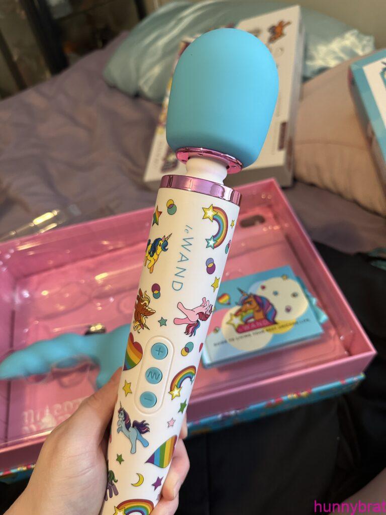 I had to make a post about this because it’s so freakin’ cute. I retired my Hitatchi Magic Wand a while ago, and decided I needed a new wand vibe and went with this one. In true Sam fashion (that’s my real name, by the way) I went with something bright and extravagant: Le Wand …